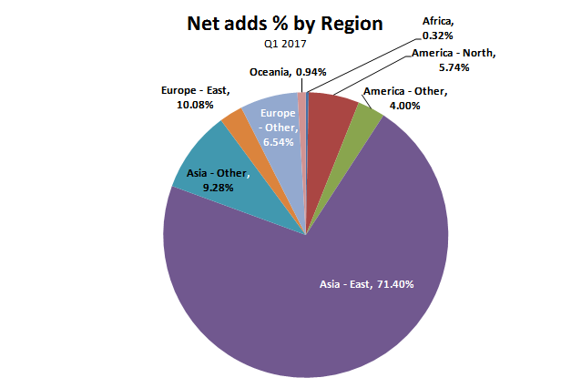 圖3 2017年第一季度各區(qū)域固網(wǎng)寬帶用戶凈增份額 (來源于:Point Topic )