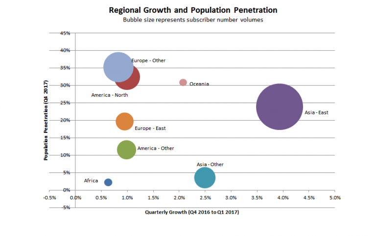 在2017年第一季度,固網(wǎng)寬帶的凈增加額的71% 來自東亞,高于2016年第四季度的49%(圖3)。該地區(qū)的季度增長率是所有地區(qū)中最高的,增長率為3.9% (圖4)。