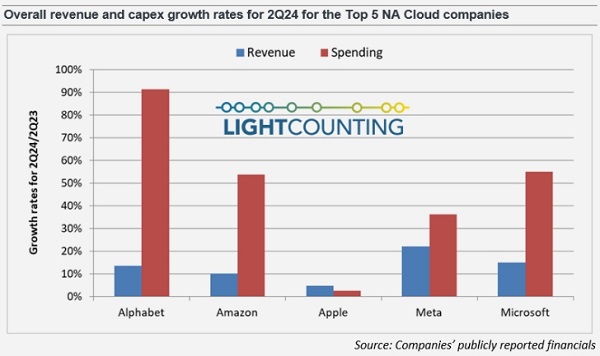 谷歌和微軟本季度的資本支出都創(chuàng)下了紀(jì)錄,分別增長了91%和55%。亞馬遜和Meta的支出也大幅增加,分別增長了54%和36%。與此同時(shí),蘋果公司的支出小幅增長了3%。這些投資的大部分都進(jìn)入了云數(shù)據(jù)中心和人工智能基礎(chǔ)設(shè)施,不僅包括服務(wù)器、GPU和CPU,還包括光連接。