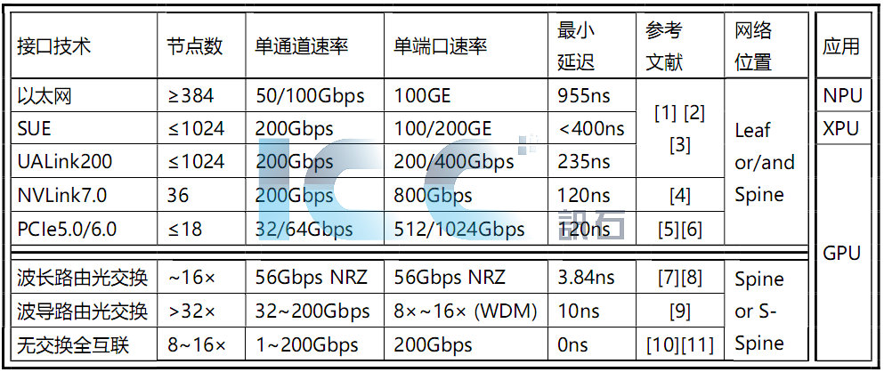 以太網(wǎng)交換是目前最成熟、應(yīng)用范圍最廣的一種網(wǎng)絡(luò)互聯(lián)技術(shù),用以太交換組成算力芯片超節(jié)點(diǎn)的技術(shù)路線具有技術(shù)成熟,易于引入成熟的以太光模塊實(shí)現(xiàn)柜間光互聯(lián),突破電互聯(lián)的單柜限制,降低對(duì)單柜供電散熱的要求,小芯片即可組成大網(wǎng)絡(luò)等優(yōu)點(diǎn)[1]。見(jiàn)表1,博通也推出了SUE(Scale Up Ethernet)方案,并盡力降低標(biāo)準(zhǔn)以太網(wǎng)的延遲[2],這兩種互聯(lián)方案分別針對(duì)NPU/XPU等算力芯片,對(duì)于網(wǎng)絡(luò)性能要求更高的GPU傾向于采用其它更低延遲的技術(shù)方案。
