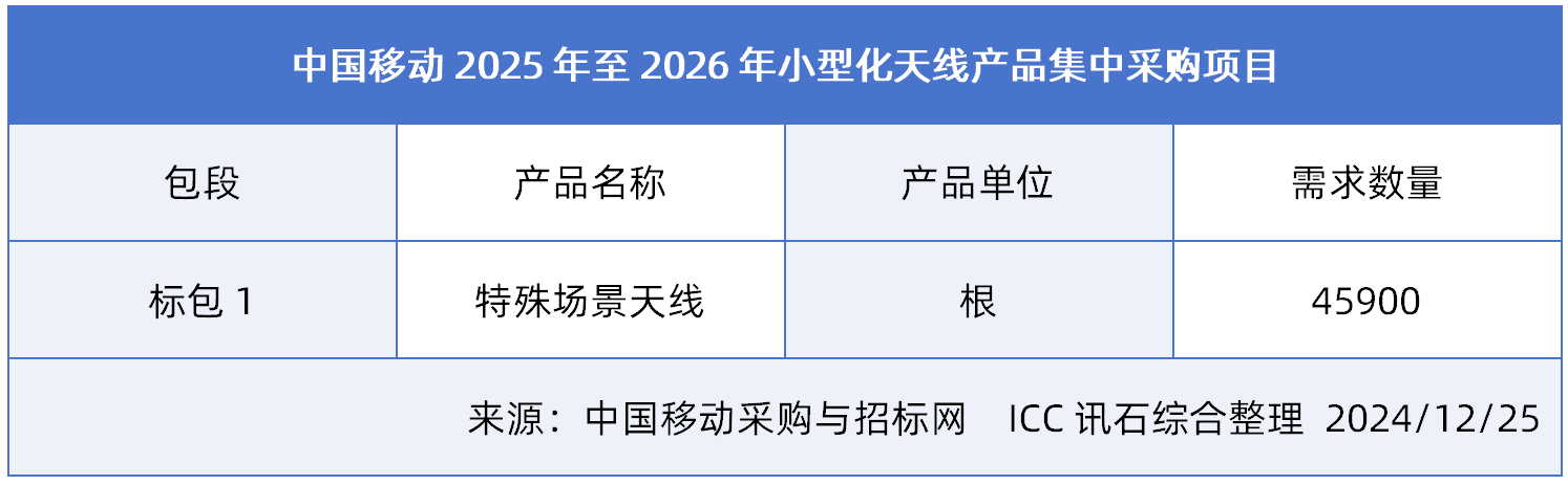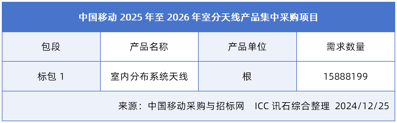 ICC訊 近日,中國移動發(fā)布“2025年至2026年室分天線產(chǎn)品集中采購項目”與“2025年至2026年小型化天線產(chǎn)品集中采購項目”兩則天線集采公告。