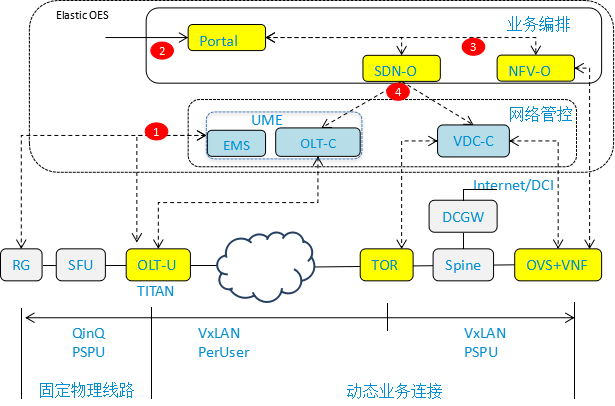 SFU/HGU放裝時,預(yù)配VLAN線路連接到OLT-U。OLT-C(控制面部件)運行在裸服務(wù)器或由TECS(VIM)加載到虛機上運行;