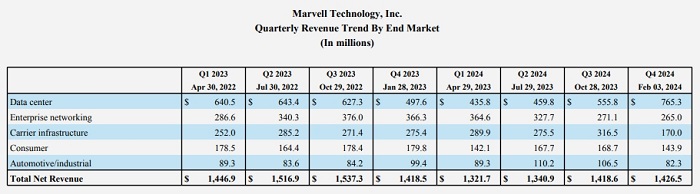 按終端市場(chǎng)劃分,第四季度數(shù)據(jù)中心市場(chǎng)營(yíng)收7.65億美元,同比增長(zhǎng)54%。運(yùn)營(yíng)商基礎(chǔ)設(shè)施市場(chǎng)營(yíng)收1.7億美元,同比下滑38%。企業(yè)網(wǎng)絡(luò)市場(chǎng)營(yíng)收2.65億美元,同比下滑28%。消費(fèi)者市場(chǎng)營(yíng)收1.44億美元,同比下滑20%。汽車/工業(yè)市場(chǎng)營(yíng)收8200萬(wàn)美元,同比下滑17%。2024財(cái)年數(shù)據(jù)中心市場(chǎng)營(yíng)收22.17億美元,相比上年下滑8%。運(yùn)營(yíng)商基礎(chǔ)設(shè)施市場(chǎng)營(yíng)收10.52億美元,相比上年下滑3%。企業(yè)網(wǎng)絡(luò)市場(chǎng)營(yíng)收12.28億美元,相比上年下滑10%。消費(fèi)者市場(chǎng)營(yíng)收6.22億美元,相比上年下滑11%。汽車/工業(yè)市場(chǎng)營(yíng)收3.88億美元,相比上年增長(zhǎng)9%。