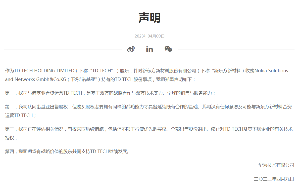 摘要:4月9日,華為官方發(fā)布聲明,稱與諾基亞合資運(yùn)營(yíng)TD TECH,是基于雙方的戰(zhàn)略合作與雙方技術(shù)實(shí)力、全球的銷售與服務(wù)能力;華為認(rèn)同諾基亞出售股權(quán),但購買股權(quán)者要擁有同樣的戰(zhàn)略能力才具備延續(xù)既有合作的基礎(chǔ)。我司沒有任何意愿及可能與新東方新材料合資運(yùn)營(yíng)TD TECH……