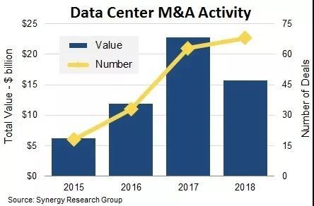 ICCSZ訊 Synergy Research Group的最新數(shù)據(jù)顯示,面向數(shù)據(jù)中心領(lǐng)域的重大并購交易(M&A)在2018年持續(xù)攀升,不過2018年交易的總價值相比2017年的峰值略有下降。該機(jī)構(gòu)表示,2018年共完成了68宗交易,總價值接近160億美元。雖然其中包括了50億美元以上的交易,但沒有一筆接近2017年完成的Digital Realty收購DuPont Fabros或Equinix收購Verizon數(shù)據(jù)中心的規(guī)模。