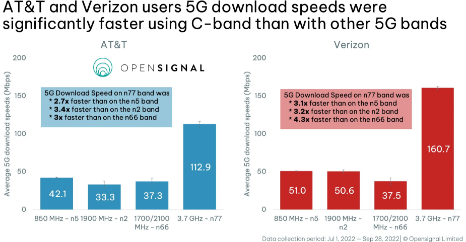 ICC訊 根據(jù)OpenSignal的說法,對于AT&T和Verizon來說,C頻段頻譜被證明是一個強(qiáng)大的武器,而且可能是一個重要的武器,因為它們試圖滿足T-Mobile的數(shù)據(jù)速度。C波段包括3.7 GHz的頻譜。