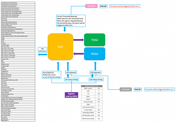 相干系統(tǒng)通過強(qiáng)大的FEC(前向糾錯(cuò)編碼)技術(shù)實(shí)現(xiàn)對(duì)傳送的bit進(jìn)行錯(cuò)誤修正,F(xiàn)EC編碼算法就像微信的語音轉(zhuǎn)換文字功能,其具備一定的口音糾錯(cuò)能力。進(jìn)行語音文字轉(zhuǎn)換時(shí),算法會(huì)根據(jù)語意來判斷是否修正口音帶來的干擾。當(dāng)你的口音很重或者引入過多方言時(shí),超過算法的容忍上限時(shí)其轉(zhuǎn)換也會(huì)出錯(cuò)。如同我們可以用轉(zhuǎn)換正確率來評(píng)估普通話標(biāo)準(zhǔn)與否一樣,我們可以根據(jù)Pre-fec前向糾錯(cuò)誤碼率來評(píng)估系統(tǒng)的性能情況。TOOP通過CFP2-DCO的Pin37 管腳來上報(bào)pre-fec前向糾錯(cuò)編碼超限的事件,實(shí)現(xiàn)了對(duì)性能劣化事件的提前關(guān)注。當(dāng)DSP檢測(cè)到Pre-fec越過設(shè)定門限,即拉高Pin37管腳,為業(yè)務(wù)的無損切換提供可能性。