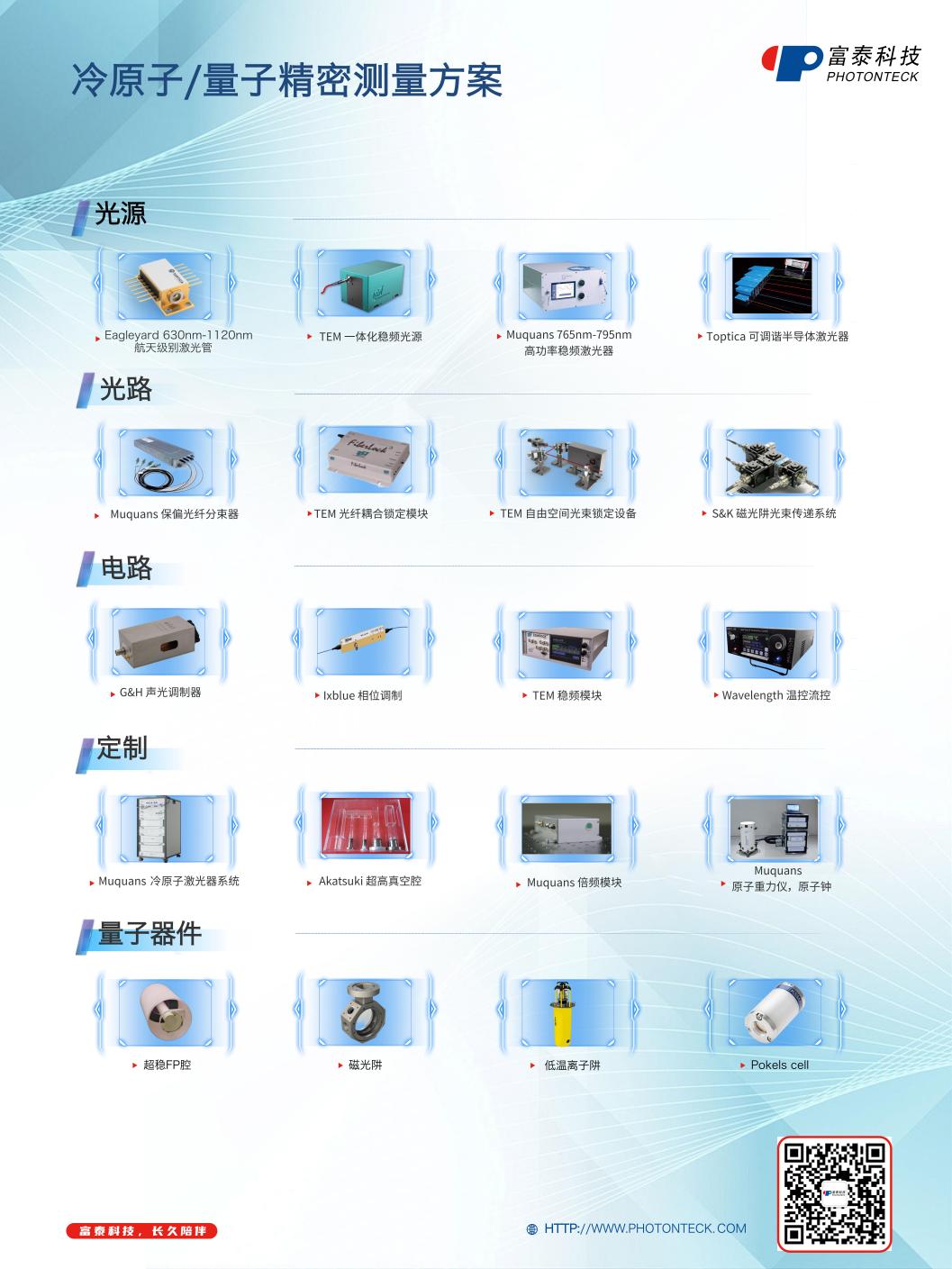 富泰科技在本次慕尼黑上海光博會(huì)上主要展出冷原子/量子精密測(cè)量解決方案、TDLAS氣體檢測(cè)方案(全光譜分析解決方案)、超快激光解決方案、醫(yī)療OCT和測(cè)量血糖解決方案、激光參數(shù)測(cè)試設(shè)備、窄線寬光纖傳感解決方案等相關(guān)配套產(chǎn)品。