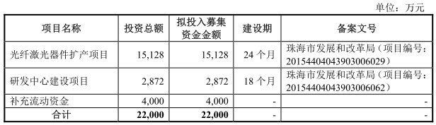 據(jù)了解,光庫科技本次募投資金總額為2.51億元,主要用于光纖激光器件的擴產項目以及研發(fā)中心的建設項目。項目達產后,公司將新增光纖激光器件設計生產能力20萬個/年,滿足公司業(yè)務不斷增長的需要,大幅增加公司主營業(yè)務盈利水平;募投項目的實施將優(yōu)化公司的設計研發(fā)環(huán)境,推動高功率、保偏、有源器件的研發(fā)工作,進一步提高公司產品研發(fā)和技術創(chuàng)新能力,豐富公司產品線。詳細情況如下表: