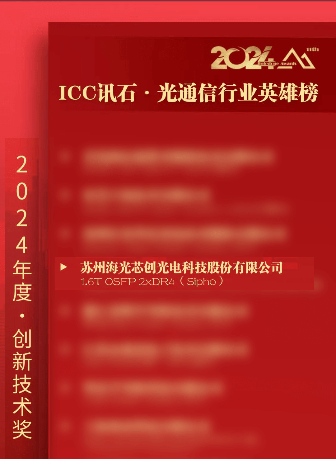 第十一屆ICC訊石·光通信行業(yè)英雄榜評選結(jié)果在大會上正式揭曉,SISPARK畢業(yè)企業(yè)——蘇州海光芯創(chuàng)光電科技股份有限公司榮獲2024年度技術(shù)創(chuàng)新獎,表彰其在補(bǔ)短板、填空白或?qū)崿F(xiàn)國產(chǎn)替代方面做出的貢獻(xiàn)。