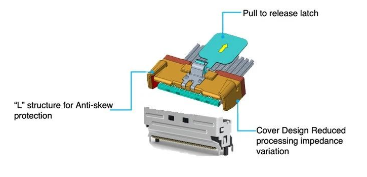 立訊技術(shù)推出的MCIO高速連接器,符合SFF-TA-10116業(yè)界標準,已在全球數(shù)據(jù)中心實現(xiàn)百萬級批量出貨,成為頭部云服務(wù)商與AI服務(wù)器廠商的首選配置。該方案的核心價值在于突破性地解決了傳統(tǒng)連接器中卡扣結(jié)構(gòu)可靠性不足所帶來的掉盤、掉帶故障。