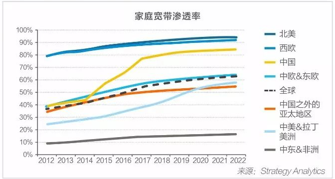 ICCSZ訊 近日,中國(guó)移動(dòng)研究院發(fā)布了《全球家庭寬帶市場(chǎng)研究報(bào)告》,2017年全球寬帶家庭用戶預(yù)計(jì)增長(zhǎng)10%。高于2012-2016年7%的年復(fù)合增長(zhǎng)率,寬帶接入營(yíng)收預(yù)計(jì)增長(zhǎng)7%,同樣高于2012-2016的5.6%的年均復(fù)合增長(zhǎng)率。預(yù)計(jì)到2017年底,全球家庭寬帶普及率將從2012年的37%增長(zhǎng)到52%。