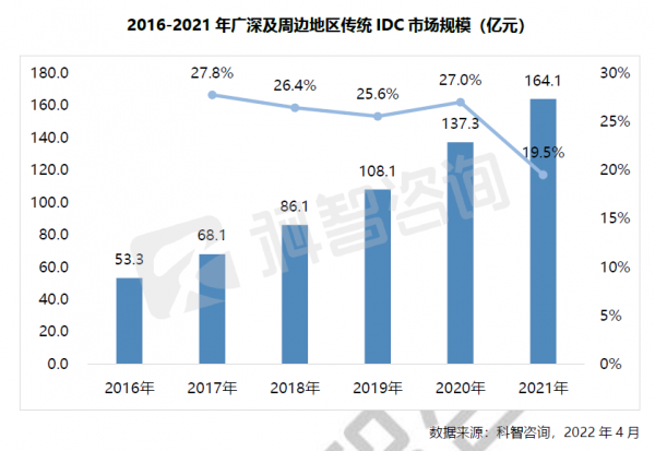 近年來,廣深及周邊區(qū)域傳統(tǒng)IDC業(yè)務市場增長速度保持在20%以上。2021年,受到互聯(lián)網(wǎng)行業(yè)需求增速放緩影響,市場規(guī)模為164.1億元,增速有所放緩。