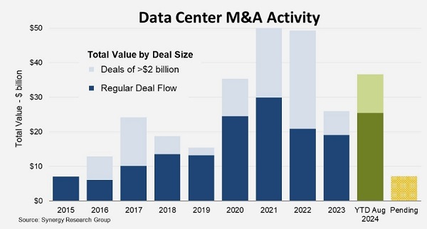 ICC訊 Synergy Research Group的新數(shù)據(jù)顯示,在經(jīng)歷了2023年的相對(duì)平靜之后,2024年以數(shù)據(jù)中心為導(dǎo)向的并購(gòu)交易將再次突破400億美元的里程碑。就所有正式完成的交易總額而言,2021年和2022年是峰值。這兩年完成的交易總價(jià)值約為500億美元。到2023年,交易總價(jià)值下降了47%,降至260億美元。然而,2021年和2022年的數(shù)字受到了該行業(yè)有史以來(lái)最大的四筆交易的推動(dòng),每筆交易的價(jià)值都達(dá)到了100億美元或更多。如果將20億美元或更大的巨額交易分開(kāi),那么所謂的“常規(guī)交易”的趨勢(shì)就會(huì)顯示出一種不同的模式。2021年仍然是峰值,2022年下降了30%,2023年再次下降,但只下降了9%,2024年現(xiàn)在有望超過(guò)2021年的紀(jì)錄。