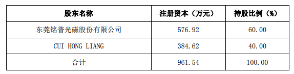 摘要:銘普光磁與自然人 CUI HONG LIANG、珠海任馳光電簽訂了《東莞銘普光磁股份有限公司與 CUI HONG LIANG 關(guān)于珠海任馳光電科技有限公司的股權(quán)轉(zhuǎn)讓及增資協(xié)議書》。根據(jù)投資協(xié)議,銘普光磁擬使用自有資金合計(jì) 2000 萬元以受讓股權(quán)和增資的形式投資任馳光電,即以 400 萬元的價(jià)格受讓 CUI HONG LIANG 持有任馳光電的 115.38 萬元注冊(cè)資本,以 1600 萬元的價(jià)格認(rèn)繳任馳光電新增注冊(cè)資本 461.54 萬元。本次交易完成后,公司將持有任馳光電 60%的股權(quán)。