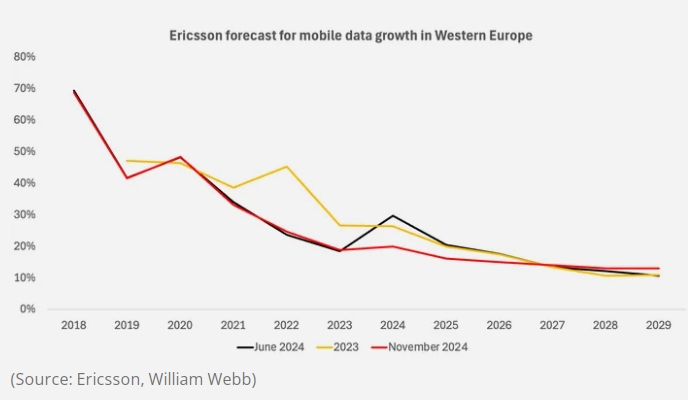 愛立信在預(yù)測(cè)方面的記錄并不出色。在將電信公司和監(jiān)管機(jī)構(gòu)的最新數(shù)據(jù)輸入模型后,其6月的移動(dòng)性報(bào)告中對(duì)歷史數(shù)據(jù)進(jìn)行了大幅向下修正。獨(dú)立顧問、英國(guó)監(jiān)管機(jī)構(gòu)Ofcom前高管William Webb注意到,愛立信還悄悄下調(diào)了支持最新報(bào)告的數(shù)據(jù)預(yù)測(cè)。西歐2029年的EB(艾字節(jié))總量比6月份低10%。愛立信還將2024年的增長(zhǎng)率從之前的30%下調(diào)至最新的20%,這樣一來,增長(zhǎng)曲線中的那個(gè)尷尬凸起就被平滑掉了,就像擠掉了一個(gè)難看的痘痘。