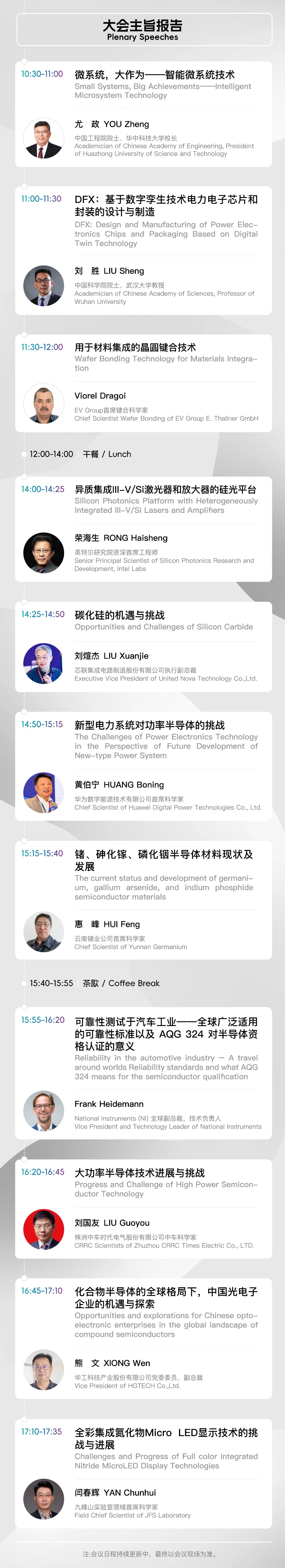 其中開(kāi)幕式環(huán)節(jié)更是眾星云集。由中國(guó)工程院院士、華中科技大學(xué)校長(zhǎng)尤政,中國(guó)科學(xué)院院士、武漢大學(xué)劉勝兩位院士領(lǐng)銜,EV Group首席鍵合科學(xué)家Viorel Dragoi,英特爾研究院資深首席工程師榮海生,芯聯(lián)集成電路制造股份有限公司執(zhí)行副總裁劉煊杰,華為數(shù)字能源技術(shù)有限的公司首席科學(xué)家黃伯寧,云南鍺業(yè)公司首席科學(xué)家惠峰,NI公司副總裁Frank Heidemann,株洲中車時(shí)代電氣股份有限公司中車科學(xué)家劉國(guó)友,華工科技產(chǎn)業(yè)股份有限公司副總裁熊文,九峰山實(shí)驗(yàn)室領(lǐng)域首席科學(xué)家閆春輝等行業(yè)精英將先后帶來(lái)精彩主旨報(bào)告,從產(chǎn)業(yè)、技術(shù)、趨勢(shì)等不同角度全面探討化合物半導(dǎo)體發(fā)展創(chuàng)新前沿大勢(shì)。