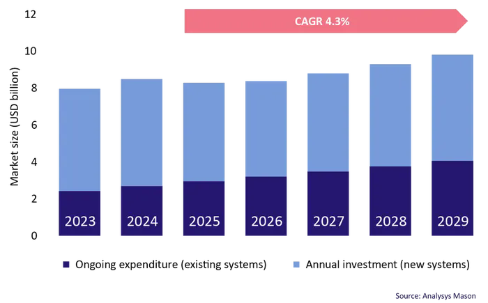Analysys Mason在11月發(fā)布的最新預(yù)測(cè)中預(yù)測(cè),全球海底光纖光纜市場(chǎng)將從2023年的79.6億美元增長到2029年的98億美元。這包括對(duì)新系統(tǒng)的投資以及對(duì)現(xiàn)有海底光纜系統(tǒng)的操作和維護(hù)的支出。