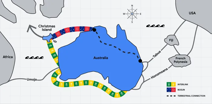 澳大利亞連接將由兩個(gè)光纜系統(tǒng)組成:Bosun海底光纜將連接澳大利亞的達(dá)爾文和圣誕島,然后再連接到新加坡,而新的互連光纜將連接墨爾本、珀斯和圣誕島。