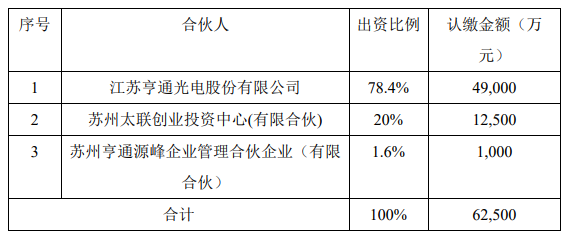 ICC訊 近日,江蘇亨通光電股份有限公司(以下簡稱“亨通光電”或“公司”)發(fā)布關(guān)于與專業(yè)投資機構(gòu)共同成立產(chǎn)業(yè)投資基金的公告稱:為促進公司在新能源、光通信及創(chuàng)新科技與工業(yè)領(lǐng)域的發(fā)展,借助專業(yè)投資機構(gòu)的行業(yè)研究、項目管理經(jīng)驗以及風險控制體系,增強協(xié)同效應(yīng),圍繞國家“碳中和”“東數(shù)西算”等國家戰(zhàn)略,發(fā)掘在海上風電、光通信、儲能、人工智能、集成電路等產(chǎn)業(yè)上的優(yōu)質(zhì)標的,推動公司的健康、可持續(xù)發(fā)展,公司擬與蘇州亨通源峰企業(yè)管理合伙企業(yè)(有限合伙)(以下簡稱“亨通源峰企業(yè)管理”)、蘇州太聯(lián)創(chuàng)業(yè)投資中心(有限合伙)(以下簡稱“蘇州太聯(lián)”)共同出資 62,500 萬元設(shè)立蘇州亨通源峰創(chuàng)業(yè)投資合伙企業(yè)(有限合伙)(暫定名,具體以工商登記核準為準)(以下簡稱“亨通源峰創(chuàng)業(yè)投資”),亨通源峰企業(yè)管理、蘇州太聯(lián)和亨通光電分別出資人民幣 1,000 萬元、人民幣 12,500 萬元和人民幣 49,000 萬元。亨通源峰創(chuàng)業(yè)投資的基金管理人為專業(yè)投資機構(gòu)北京磐茂投資管理有限公司。