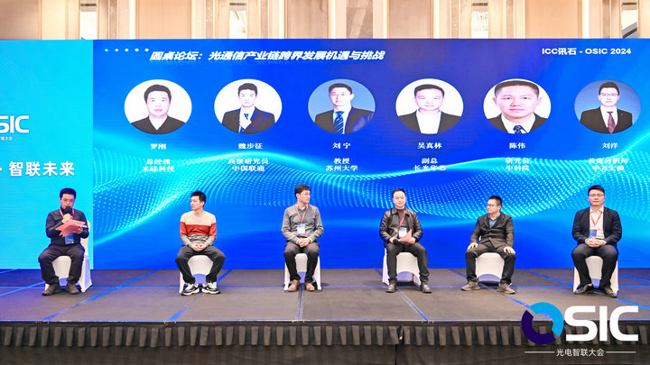 專題論壇最后,OSIC 大會(huì)還舉辦了圓桌論壇“光通信產(chǎn)業(yè)鏈跨界發(fā)展機(jī)遇與挑戰(zhàn)”,由米硅科技總經(jīng)理羅剛擔(dān)任主持,中國(guó)聯(lián)通魏步征、申萬宏源劉洋、蘇州大學(xué)劉寧、長(zhǎng)光華芯吳真林、中科院半導(dǎo)體所陳偉出任互動(dòng)嘉賓。大家圍繞光通信產(chǎn)業(yè)鏈在跨界融合中遭遇的技術(shù)問題和市場(chǎng)挑戰(zhàn),如何抓住人工智能+光電的融合機(jī)遇,如何構(gòu)建核心競(jìng)爭(zhēng)力以及如何發(fā)揮政策優(yōu)勢(shì)進(jìn)行了深度探討和交流分享。