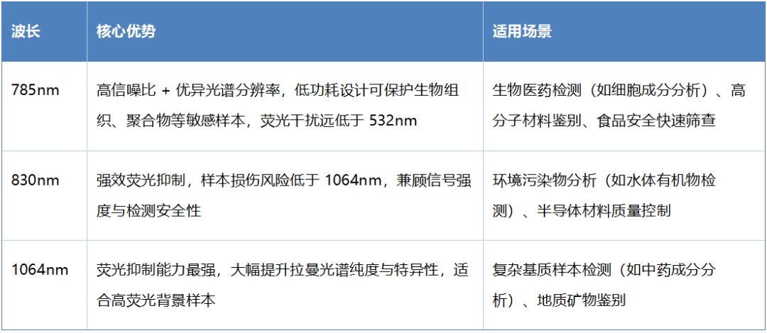 ? 精準(zhǔn)選頻,抑制熒光:精選近紅外(NIR)波段核心波長,785nm、830nm、1064nm 三款主流波長各有所長,可根據(jù)樣本特性靈活匹配,最大限度減少熒光干擾,同時(shí)避免高功率對敏感樣本的損傷。