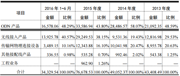 科信技術(shù)專注于FTTX 接入網(wǎng)、無線接入網(wǎng)和傳輸網(wǎng)中通信網(wǎng)絡(luò)物理連接設(shè)備及解決方案的提供,主要產(chǎn)品包括 FTTX 接入網(wǎng)ODN 系列產(chǎn)品、無線接入系列產(chǎn)品以及傳輸網(wǎng)相關(guān)產(chǎn)品等。公告給出了2016年1-6月各類產(chǎn)品銷售數(shù)據(jù),其中ODN產(chǎn)品營收1.66億元,占比48.29%,無線接入產(chǎn)品營收1.39億元,占比40.25%,這兩類產(chǎn)品占據(jù)科信技術(shù)產(chǎn)品近9成的銷售額。