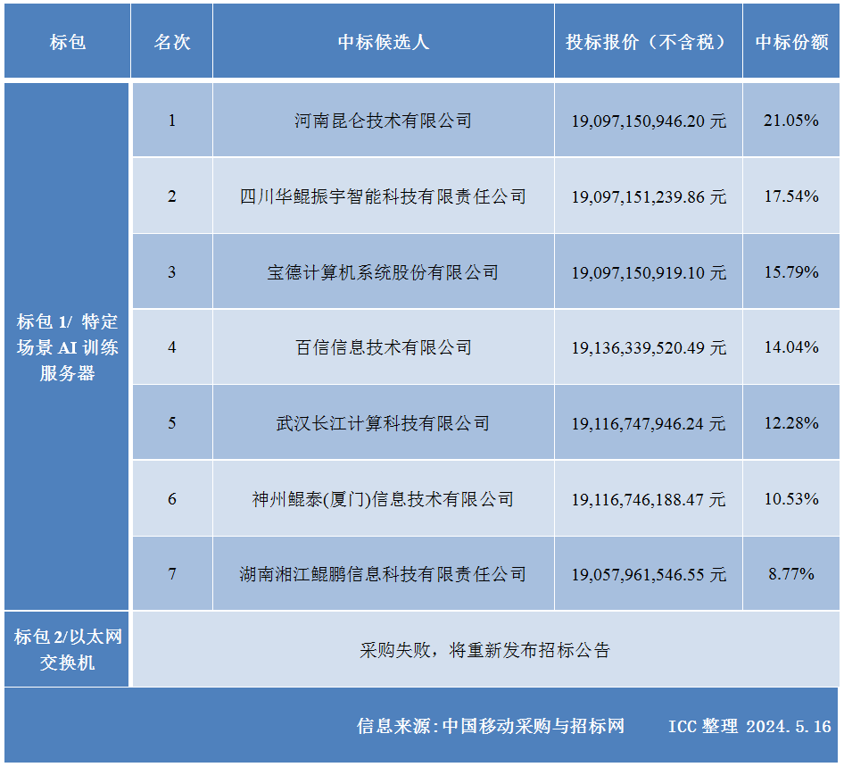 據(jù)了解,中國移動于5月16日,在官網(wǎng)公示了2024年至2025年新型智算中心采購中選名單。標包1,昆侖技術、華鯤振宇、寶德計算機等七家廠商入選。標包2采購失敗,重新招標。