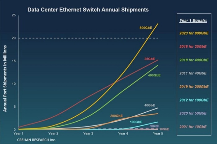 這次增長的一個關鍵因素是800 GbE數據中心交換機部署的顯著加速,這些設備為人工智能計算集群提供了網絡架構。這一強勁的開局進一步印證了800GbE將以史上最快的速度在數據中心以太網交換機市場中普及的預期(參見附圖),即到2027年,800GbE交換機的年端口出貨量將超過2000萬。