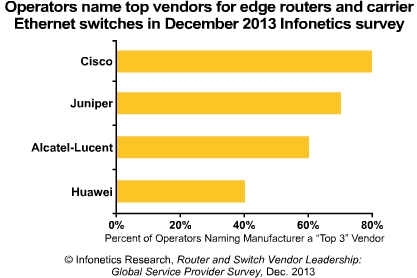 ICCSZ訊 日前,市場調(diào)研公司Infonetics發(fā)布其最新的2013年路由器和交換機供應(yīng)商領(lǐng)導(dǎo)者:全球服務(wù)供應(yīng)商調(diào)查,以探討服務(wù)供應(yīng)商選擇邊緣路由器和運營商以太網(wǎng)交換機(CES)制造商及服務(wù)供應(yīng)商的選擇標(biāo)準(zhǔn)。