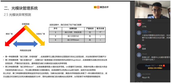 張璋最后表示,隨著數(shù)據(jù)中心網(wǎng)絡(luò)架構(gòu)和光模塊正在向400G架構(gòu)演進(jìn),美團(tuán)數(shù)據(jù)中心后續(xù)將注重AIOPS和光模塊運(yùn)維,利用機(jī)器學(xué)習(xí)分析告警閾值,對(duì)網(wǎng)絡(luò)、設(shè)備、光模塊、光傳輸?shù)雀嗑?xì)特征指標(biāo)異常發(fā)現(xiàn)及在線趨勢(shì)預(yù)測(cè),并做數(shù)據(jù)故障分析,結(jié)合業(yè)內(nèi)數(shù)據(jù)、大數(shù)據(jù)分析及專家經(jīng)驗(yàn)和知識(shí)圖譜,分析光模塊異常趨勢(shì)。