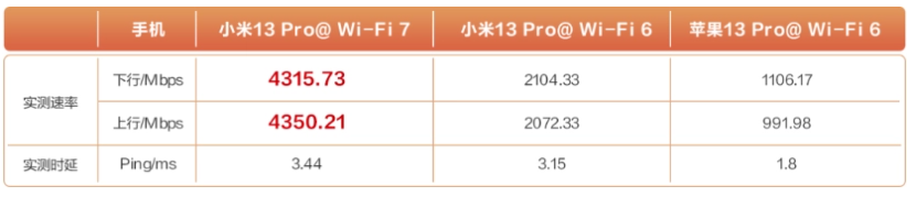 從測(cè)試結(jié)果中得知,在支持 Wi-Fi 7 通信協(xié)議標(biāo)準(zhǔn)的小米 13 Pro 測(cè)試下,單終端速率超 4.3Gbps。相比于 Wi-Fi 6 環(huán)境下的小米 13 Pro 速率提升 100% 、相比于 Wi-Fi 6 環(huán)境下蘋果 13 Pro 速率提升 300%。除了速率的飆升,相較于 Wi-Fi 6 協(xié)議平均 10ms 的時(shí)延,Wi-Fi 7 AP 下三個(gè)手機(jī)平均時(shí)延都在 4ms 之內(nèi)。