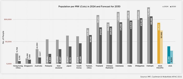 ICC訊 房地產(chǎn)咨詢公司高緯環(huán)球(Cushman & Wakefield)最新年度調(diào)查指出,盡管近年投資與容量呈爆發(fā)式增長,大多數(shù)亞太國家仍處于"嚴(yán)重供給不足"狀態(tài)。數(shù)據(jù)顯示,亞洲市場平均每兆瓦(MW)數(shù)據(jù)中心容量需服務(wù)約35萬人,是美國3.06萬人水平的十倍之多。
