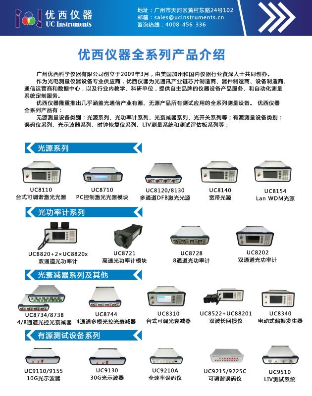 目前,優(yōu)西儀器全系列產(chǎn)品有:(1)無源測量設(shè)備類別:光源系列、光功率計(jì)系列、光衰減器系列、光開關(guān)系列等;(2)有源測量設(shè)備類別:誤碼儀系列、光示波器系列、時(shí)鐘恢復(fù)儀系列、LIV測量系統(tǒng)和測試評估板系列等。