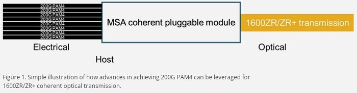 圖 1. 簡單說明如何利用 200G PAM4 技術的進步來實現(xiàn) 1600ZR/ZR + 相干光傳輸。