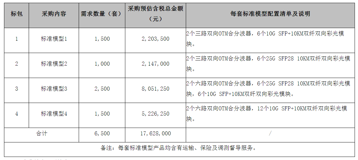 根據(jù)5月29日發(fā)布的招標(biāo)公告顯示,天津移動該項(xiàng)目擬采購無源光纖復(fù)用設(shè)備6500套,按照產(chǎn)品標(biāo)準(zhǔn)模型分為4個標(biāo)包,采購預(yù)估含稅總金額共計(jì)17,628,000元,其中標(biāo)包1預(yù)估含稅總金額為2,203,500元,標(biāo)包2預(yù)估含稅總金額為2,147,000元,標(biāo)包3預(yù)估含稅總金額為8,051,250元,標(biāo)包4預(yù)估含稅總金額為5,226,250元。(注:每個標(biāo)包的預(yù)估含稅總金額同時為坐高投標(biāo)限價,超過將被否決。)