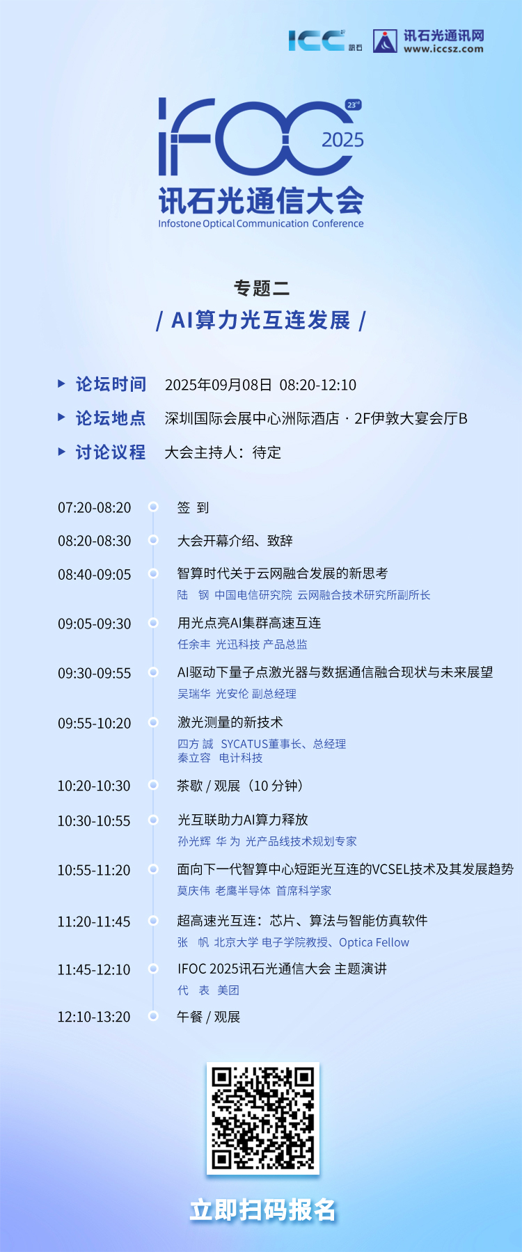 ICC訊 2025年9月8日至9日,IFOC 2025訊石光通信大會(huì)將于深圳國(guó)際會(huì)展中心洲際酒店隆重召開(kāi)。本屆大會(huì)以“AI時(shí)代的光電子技術(shù)機(jī)遇與挑戰(zhàn)”為核心,匯聚產(chǎn)業(yè)、學(xué)術(shù)、研發(fā)及投資等多方專業(yè)人士,共同探討光通信領(lǐng)域的最新技術(shù)、市場(chǎng)趨勢(shì)與生態(tài)合作,助力中國(guó)光電子產(chǎn)業(yè)實(shí)現(xiàn)創(chuàng)新突破與可持續(xù)發(fā)展。