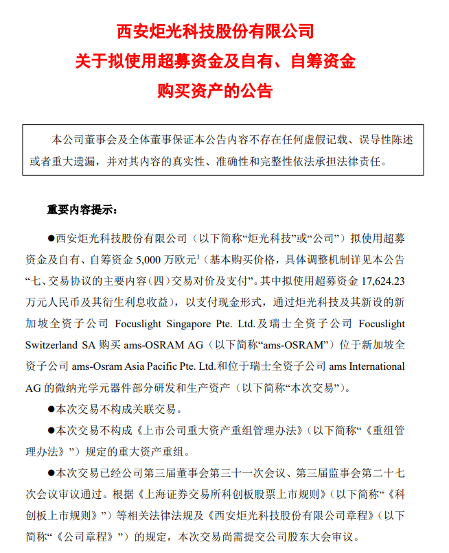 5月7日,炬光科技與ams-OSRAM 簽署《資產(chǎn)購買協(xié)議》,炬光科技及其新設(shè)的新加坡全資子公司 Focuslight Singapore Pte. Ltd.及瑞士全資子公司 Focuslight Switzerland SA 將購買ams-OSRAM AG(以下簡稱“ams-OSRAM”)位于新加坡全資子公司ams-Osram Asia Pacific Pte. Ltd.和位于瑞士全資子公司 ams International AG的微納光學(xué)元器件部分研發(fā)和生產(chǎn)資產(chǎn)。炬光科技擬使用超募資金及自有、自籌資金5000萬歐元(折合人民幣約3.84億元)用于支付本次交易對價,其中,公司擬使用超募資金1.76億元及其衍生利息收益。