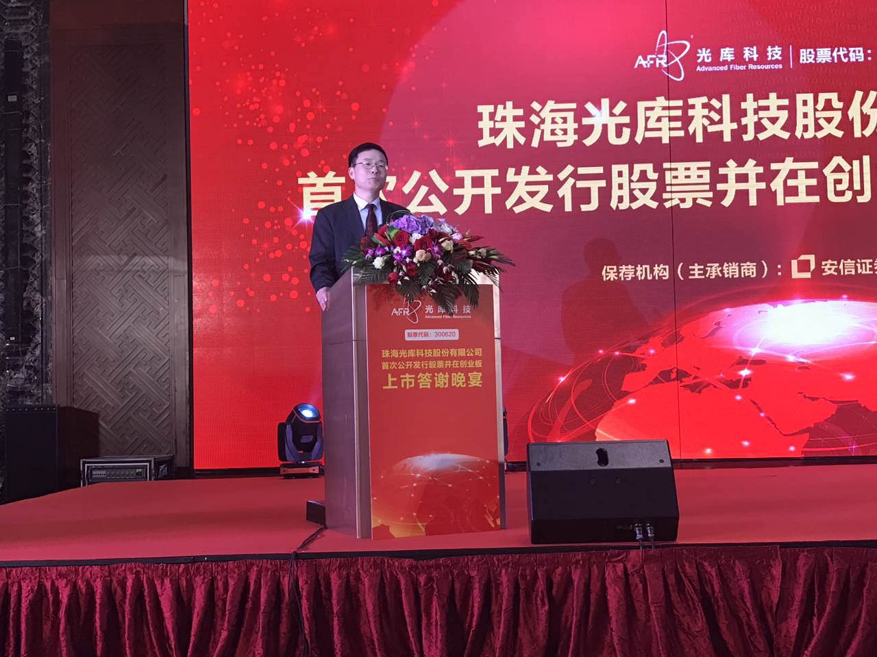 接下來是光庫總經(jīng)理王興龍發(fā)表致辭,首先王總對各位嘉賓的到來表示熱烈的歡迎和感謝。并闡述了17年來光庫科技一步一個(gè)腳印成長的艱辛,也感謝了珠海高新區(qū)政府、公司管理團(tuán)隊(duì)、員工以及安信證券對光庫發(fā)展與上市的幫助和支持。