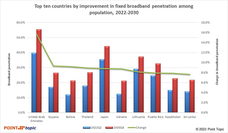 Figure 5. Top ten countries by predicted improvement in fixed broadband penetration among population, 2022 – 2030. Source: Point Topic.