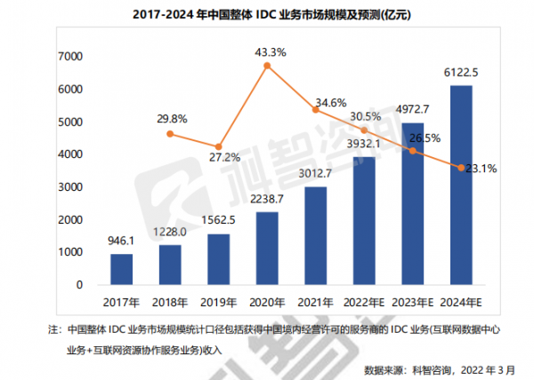 摘要:“2021年,中國整體IDC業(yè)務(wù)市場總體規(guī)模突破3000億元,達(dá)到3012.7億元,同比增長34.6%,相較于2020年的43.3%,增速有所放緩。