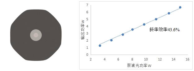 鉺鐿共摻、保偏鉺鐿共摻光纖是實(shí)現(xiàn)高性能1.5μm激光雷達(dá)光源的核心增益材料,長(zhǎng)飛公司基于良好的平臺(tái)優(yōu)化,現(xiàn)推出多型號(hào)、多種結(jié)構(gòu)的,滿足不同雷達(dá)測(cè)距方案的鉺鐿共摻光纖。針對(duì)時(shí)間飛行法的測(cè)距雷達(dá),推出雙包和三包的鉺鐿共摻光纖,產(chǎn)品具備精確的幾何控制精度和產(chǎn)品一致性可調(diào)的吸收系數(shù)和高的光光轉(zhuǎn)換效率、良好的耐高溫性和長(zhǎng)期可靠性。圖1是10/125 DC EYDF的幾何端面圖和光放大性能結(jié)果圖,光纖斜率效率可達(dá)43.6%。