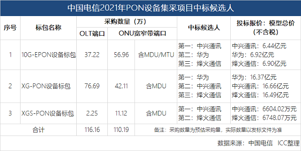 根據(jù)2021年中國電信PON設(shè)備集采中標(biāo)結(jié)果顯示,中興、烽火、華為三家中標(biāo),具體情況如下圖: