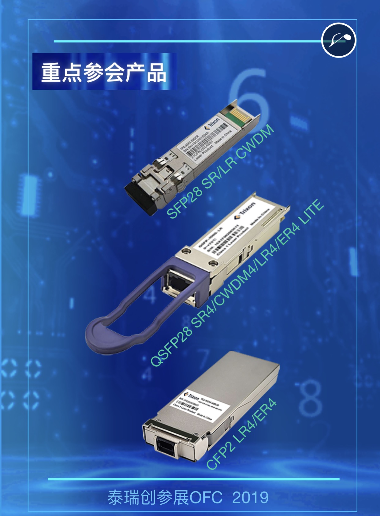 ICCSZ訊 “一年之計在于春“,在這萬物復蘇、充滿活力的季節(jié),一年一度光電行業(yè)盛會--美國光纖通訊展(OFC)將于2019年3月3-5日在美國圣地亞哥隆重舉行。四川泰瑞創(chuàng)通訊技術(shù)股份有限公司做為專業(yè)的光模塊制造商,將攜5G(前傳/中傳/回傳)全套光模塊解決方案參加本次盛會,展位號是 5120#,恭候您前來洽談指導,共商合作,共尋商機。