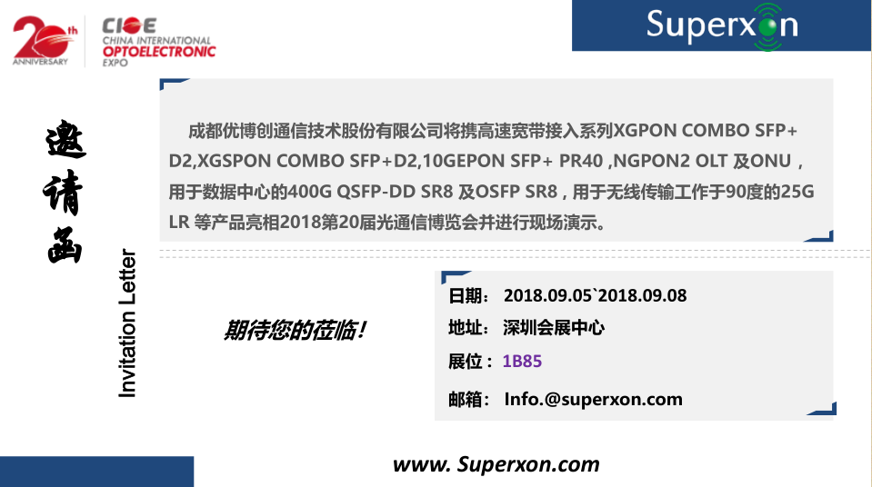 ICCSZ訊 成都優(yōu)博創(chuàng)通信技術股份有限公司將攜高速寬帶接入系列XGPON COMBO SFP+ D2,XGSPON COMBO SFP+D2,10GEPON SFP+ PR40 ,NGPON2 OLT 及ONU ,用于數(shù)據中心的400G QSFP-DD SR8 及OSFP SR8 , 用于無線傳輸工作于90度的25G LR 等產品亮相2018第20屆光通信博覽會并進行現(xiàn)場演示。