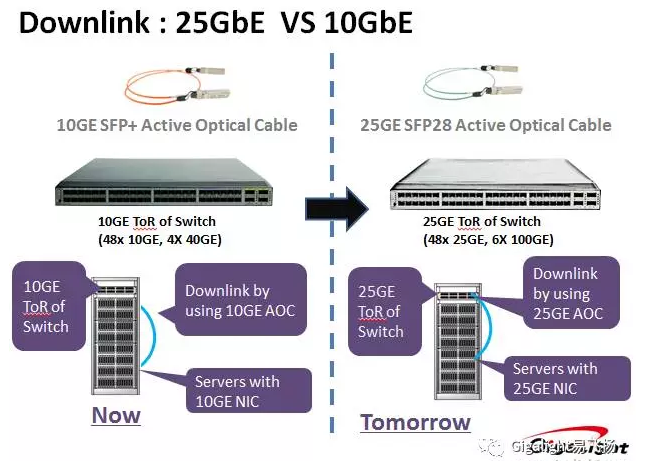 和40GE相比較,25GE以太網(wǎng)服務(wù)器到25GE TOR交換機連接,25GE它能在機架內(nèi)支持更高的服務(wù)器密度。