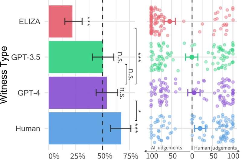 加州大學(xué)圣地亞哥分校的研究人員招募了 500 名參與者,讓他們與四位“對話者”進(jìn)行五分鐘的交流,這四位“對話者”分別是真人、上世紀(jì) 60 年代的初代聊天機(jī)器人 ELIZA、以及驅(qū)動聊天機(jī)器人 ChatGPT 的 GPT-3.5 和 GPT-4。參與者在對話結(jié)束后需判斷對方是人還是機(jī)器。