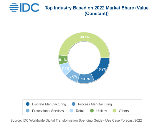 從行業(yè)角度來看,離散和流程制造行業(yè)將占今年全球數(shù)字化轉(zhuǎn)型支出的近30%,其次是專業(yè)服務(wù)和零售行業(yè)。公用事業(yè)和銀行業(yè)今年的數(shù)字化轉(zhuǎn)型支出也將超過1億美元。與此同時,在2022-2026年的預(yù)測期內(nèi),金融服務(wù)行業(yè)將實現(xiàn)最快的數(shù)字化轉(zhuǎn)型支出增長,證券和投資服務(wù)、保險和銀行業(yè)的5年復(fù)合年增長率都將達(dá)到19%或更高。