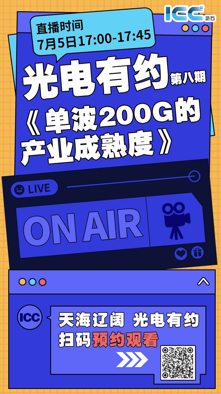 7月5日下午17:00-17:45,《ICC訊石?光電有約》聚焦單波200G,聊聊技術(shù)的成熟度,敬請(qǐng)預(yù)約觀看!7月8-12日,《ICC訊石·光電有約》還將陸續(xù)推出單波200G系列(中)、(下),從芯片發(fā)射端,到傳輸、測(cè)試與生產(chǎn),聊透單波200G,聊透核心要點(diǎn),敬請(qǐng)關(guān)注!