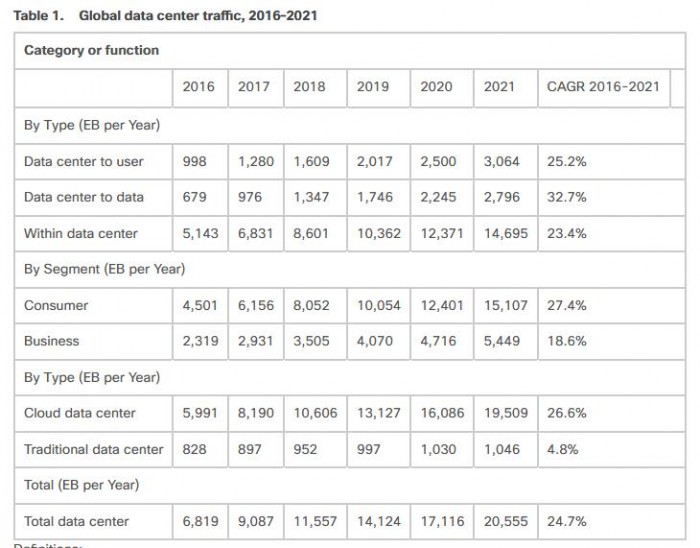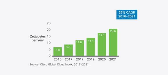 在報(bào)告中預(yù)測(cè)在2021年全球云數(shù)據(jù)中心流量年流量將達(dá)到19.5ZB,而在2016年這個(gè)數(shù)字僅僅為6.0ZB(1ZB等于10億TB)。2016年云數(shù)據(jù)中心流量占總數(shù)據(jù)中心流量的88%,而在2021年這個(gè)數(shù)字有望攀升至95%。